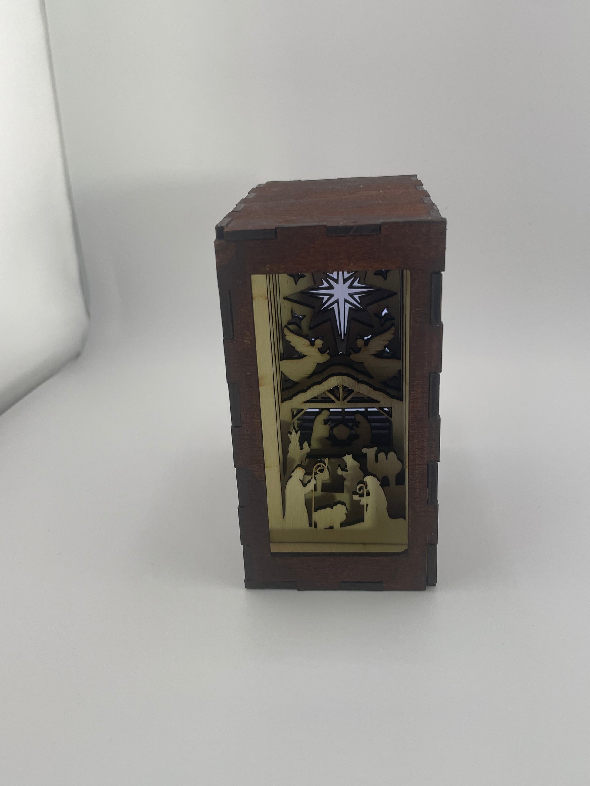 The Light of the Nativity is a beautifully made wooden shadow box, handcrafted from natural basswood and featuring an illuminated nativity scene that glows softly from within.
